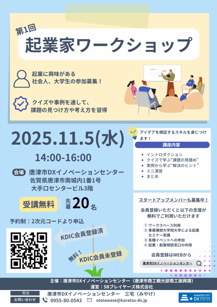 唐津市DXイノベーションセンターでは、地域に根ざした起業家育成を目的に、実践的に学べる「起業家ワークショップ」シリーズをスタートします📖。