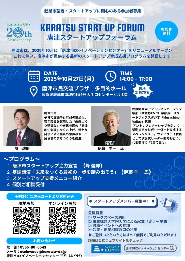 市内外の起業家や事業者が集い、学び合い、新しい挑戦を後押しする拠点として、さらに充実した機能を整え、その取り組みの一環で「唐津スタートアップフォーラム」を開催します。唐津市長によるスタートアップ注力宣言や起業・新規事業分野の第一線で活躍する講師による基調講演、最新のスタートアップ支援メニューの紹介など、充実したプログラムを用意してます。