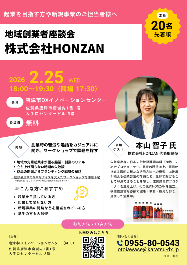 唐津市DXイノベーションセンターでは、地域で挑戦を続ける起業家を招き、その創業ストーリーや事業のリアルを共有する 「地域創業者座談会」 を開催しています。今回のゲストは、株式会社HONZAN 代表取締役 本山智子 氏です。