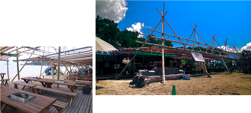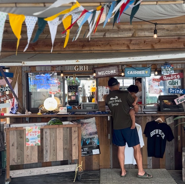 グリーンビーチハウスは今年で14期目を迎えます。 開業当初から「お客様に楽しんでもらえる空間づくり」を目指し、従来ある“プレハブ小屋スタイルの海の家” ではなく、 野外イベントの開催やBBQ スペース・キッズスペースを設けてマリンスポーツや海水浴を楽しむ客層以外の方々にも利用してもらえるよう工夫しています。 また、外観にもこだわっており「ウッドデッキ」や「バンブールーフ」などお店に訪れる方々に非日常を感じでもらえるような仕掛けを店内の至るところに設置しています。 元々前職でログハウスの建築に携わっていた事もあり、それらの経験を活かして自分で店舗設計・建築を手掛けています。