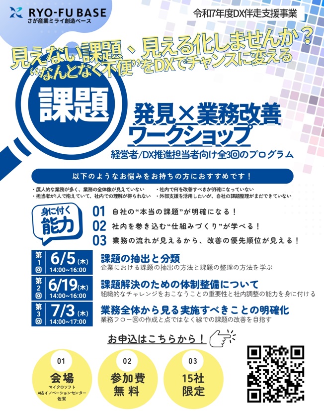 このたび、佐賀県では県内中小企業の皆さまのDX推進を目的とした新たな支援事業として、「課題発見×業務改善ワークショップ」(参加無料)を開催いたします。本ワークショップは、佐賀県が選定する5社に対して、専門家による半年間の無償伴走支援「DX伴走支援プログラム」への応募に必要な前提ステップとなっております。今後の業務改善・DX推進の第一歩として、非常に有意義な内容となっておりますので、ぜひご参加ください。